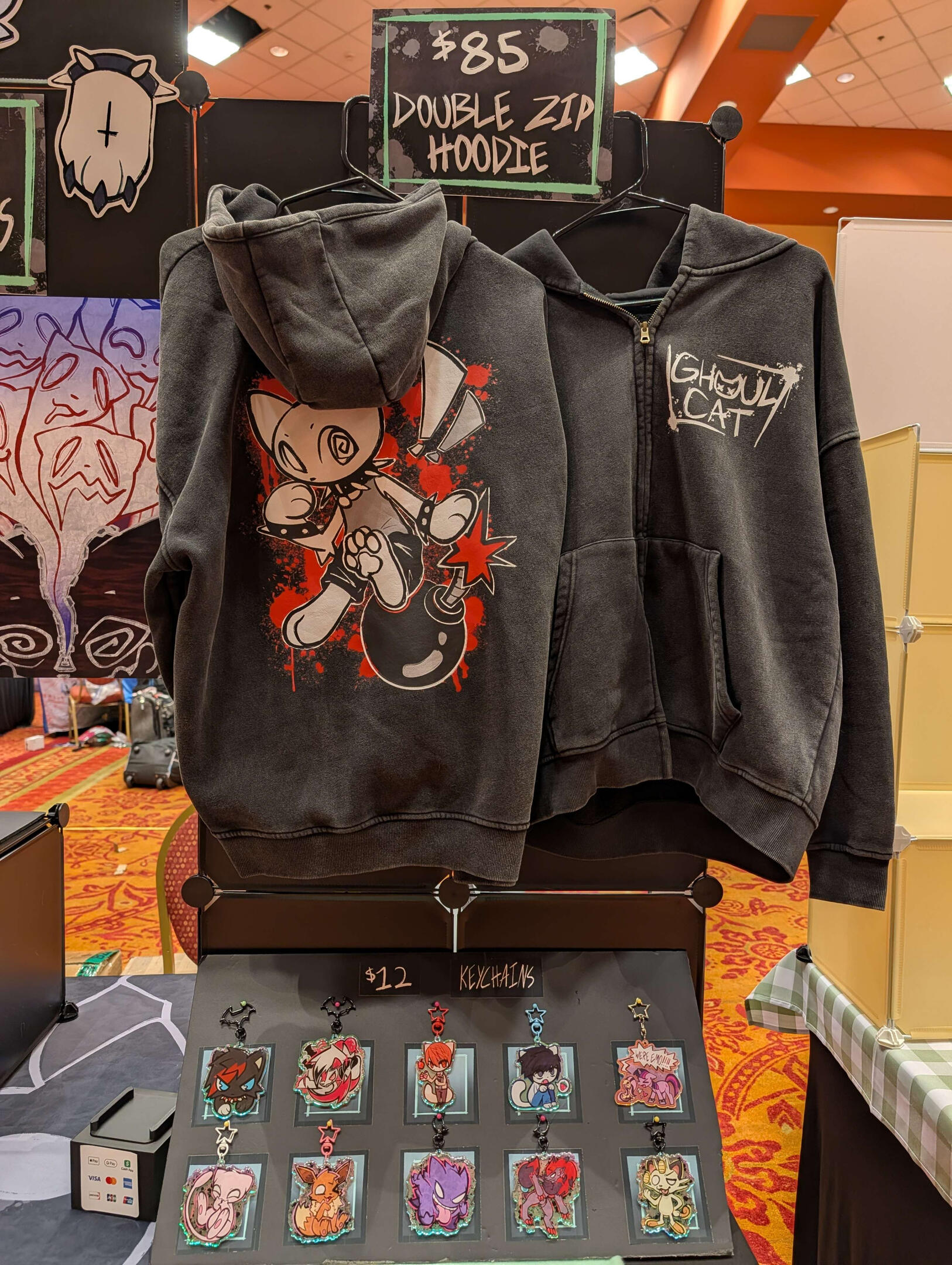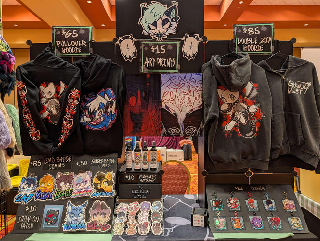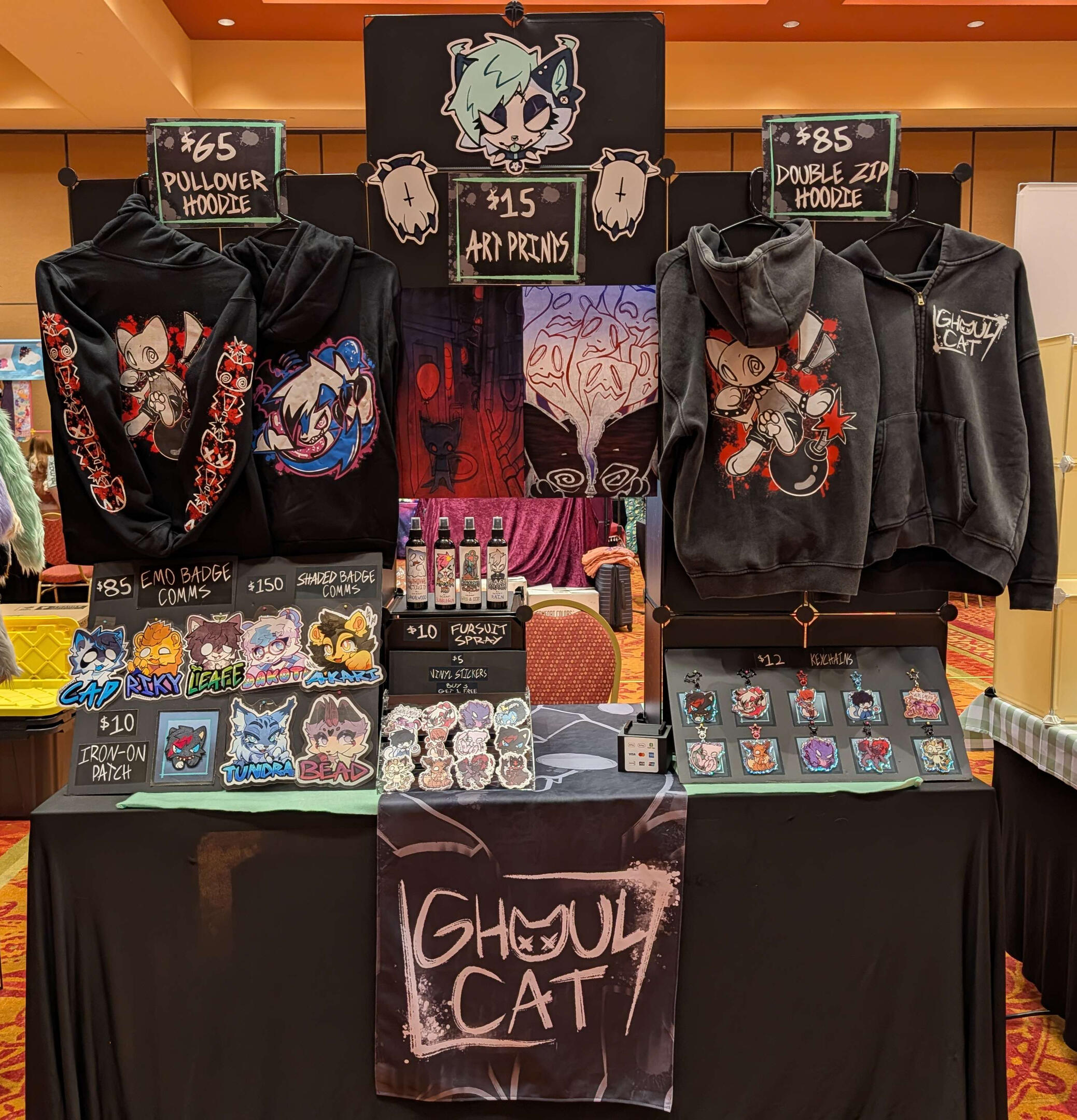 Hi, I'm GHOULCAT !! I'm a transmasc digital artist from Oklahoma who's been in the furry fandom since 2016, and started vending at conventions as of 2025!I <3 cutesy horror and specialize in bringing an emo/early internet aesthetic to the things I create, as a kid who grew up with unrestricted internet access (it shows)My first time vending was at AnthroExpo 2025 in the Artist Alley, and since then, I've upgraded to a full Dealer's Den setup! As I continue to vend at more conventions and expand my display and range of products, I will keep this page updated :3